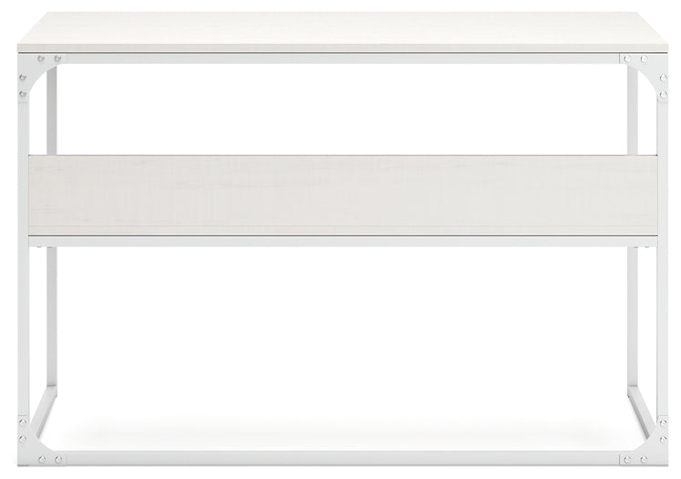 Bring your vision of a modern home workspace to life with this sleekly designed home office desk. Its linear construction and white finish keep things minimal. A small shelf along the back rounds out the versatile, striking desk.