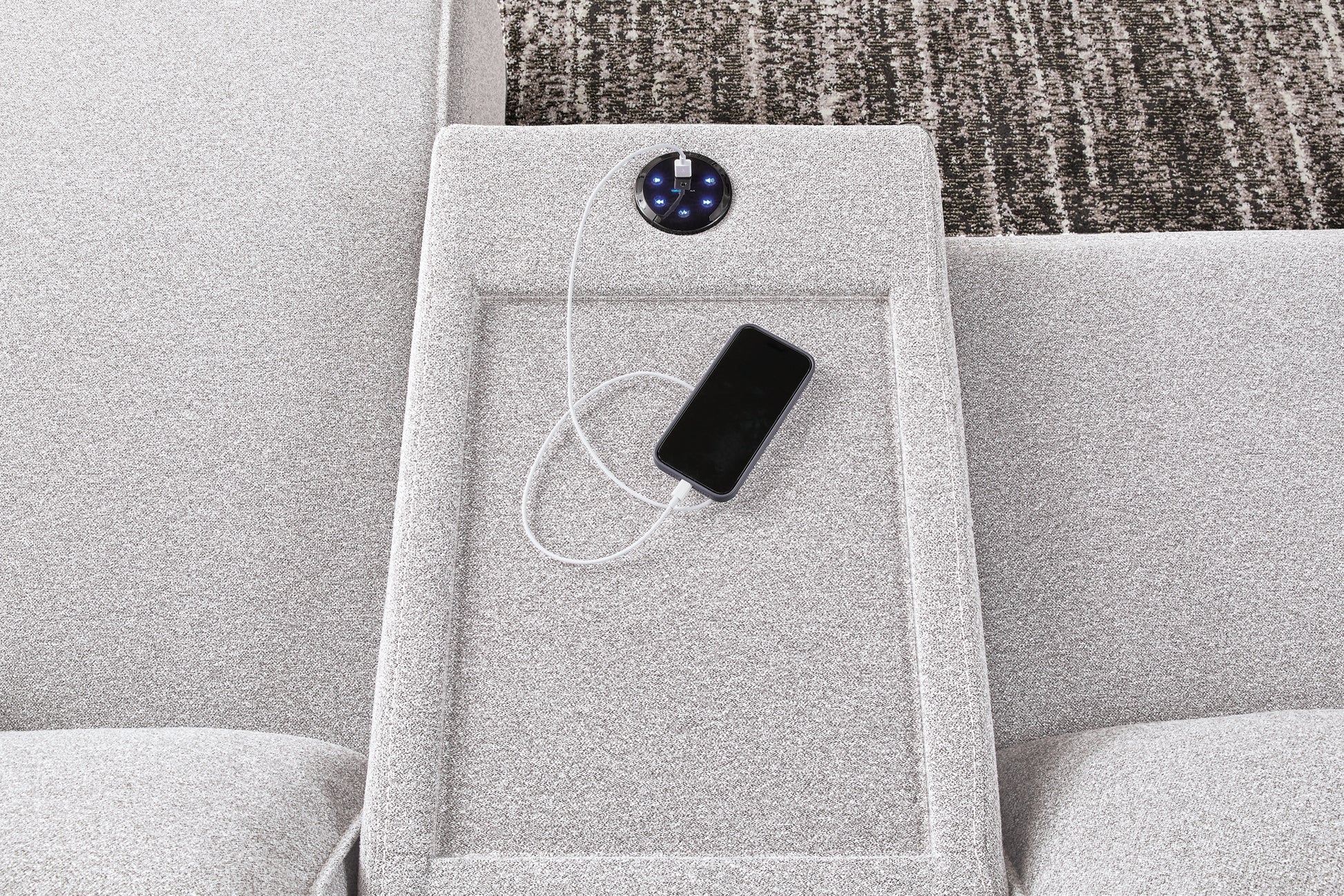 | Details | Includes 7 modular pieces: left-arm facing power recliner, power armless recliner, armless chair, wedge, 2 consoles with audio systems and right-arm facing power chaise, "Left-arm" and "right-arm" describe the position of the arm when you face the piece, Versatile modular pieces fit together in a variety of configurations, One-touch power reclining with adjustable positions and Easy View™ adjustable headrest, Zero-draw USB-A charging only consumes power when in use, Reinforced frame and metal seat box provide added stability, Attached back and seat cushions; high-quality foam cushions wrapped in poly fiber, Polyester upholstery; Next-Gen Nuvella™ is a performance fabric that is soft, easy to clean, stain-resistant and durable, Clean fabric with mild soap and water, let air dry; for stubborn stains, use a solution of 4 oz. bleach to 28 oz. water, Throw pillows with easy-to-remove zippered covers for machine washing; pillows with soft polyfill, Zero wall recliner design requires minimal space between wall and chair back, Console with plexiglass top; built-in audio sound system with wireless connectivity; audio controls located on console; USB charging, Power cord included; UL Listed | |